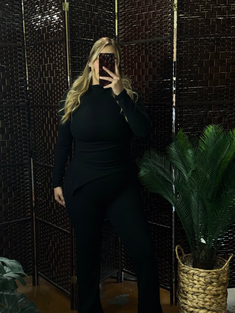 BRUSHED ECOTE RIB L/A FUNEL NECK PLEATED TOP EL. PANTS SET
